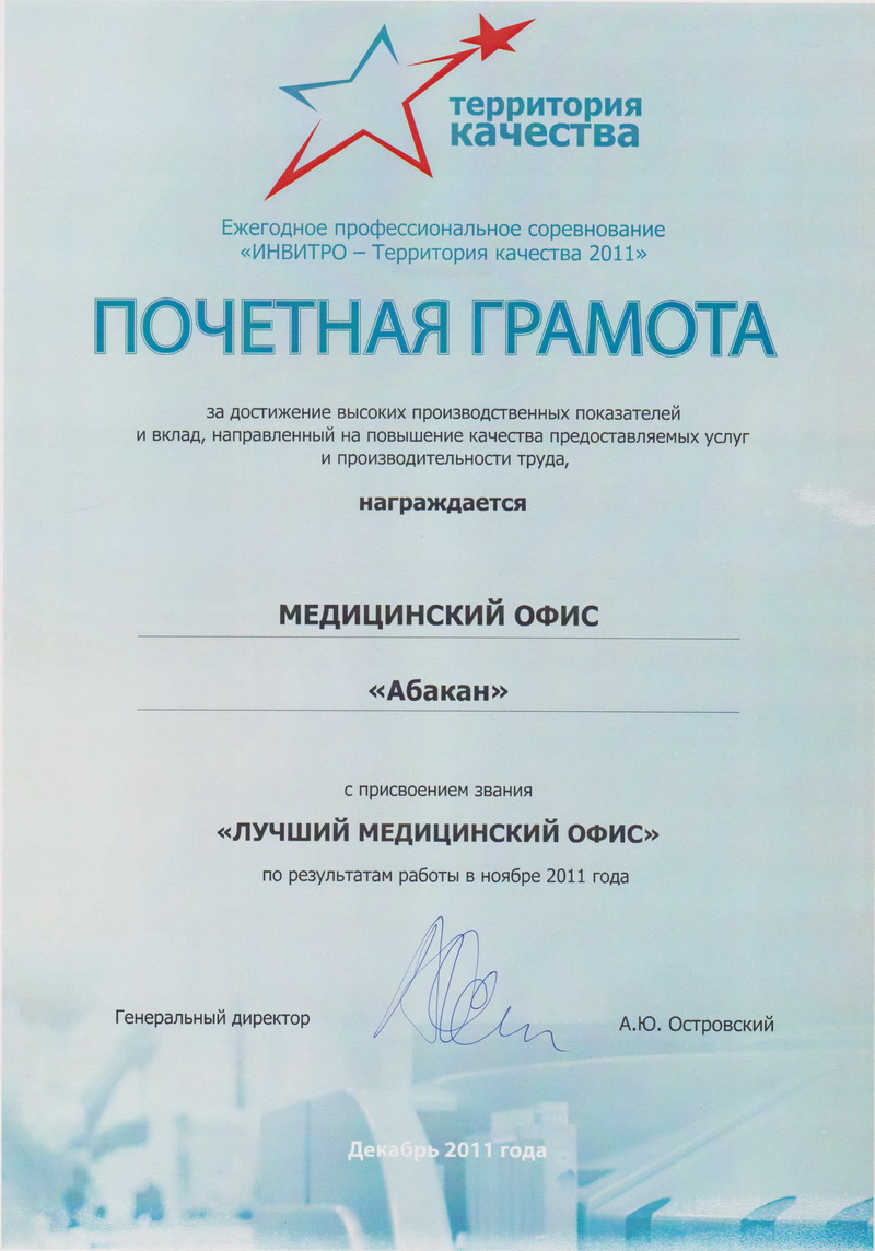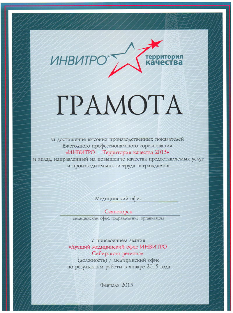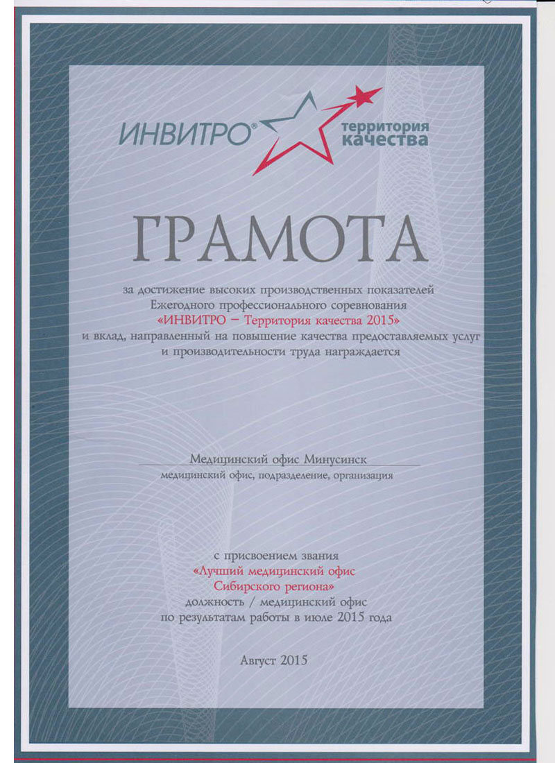 «Будьте здоровы» – это не просто название нашей клиники, это искреннее пожелание каждому человеку! В рамках ежегодного профессионального конкурса «ИНВИТРО – территория качества» медофисы ООО «Будьте здоровы!» регулярно становятся победителями, с присвоением звания «Лучший медицинский офис Сибирского региона».